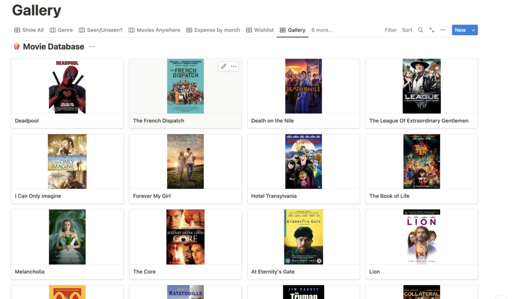 I you love movies, and have a personal collection, that you want to keep track on, you will love this. This fully packed notion template contains prefilled data with thumbnails for more than 500 movies. You just need to add if you own a movie, which platform has it, the data base will show you different views. You can keep track of your owned movies, the wished ones etc.